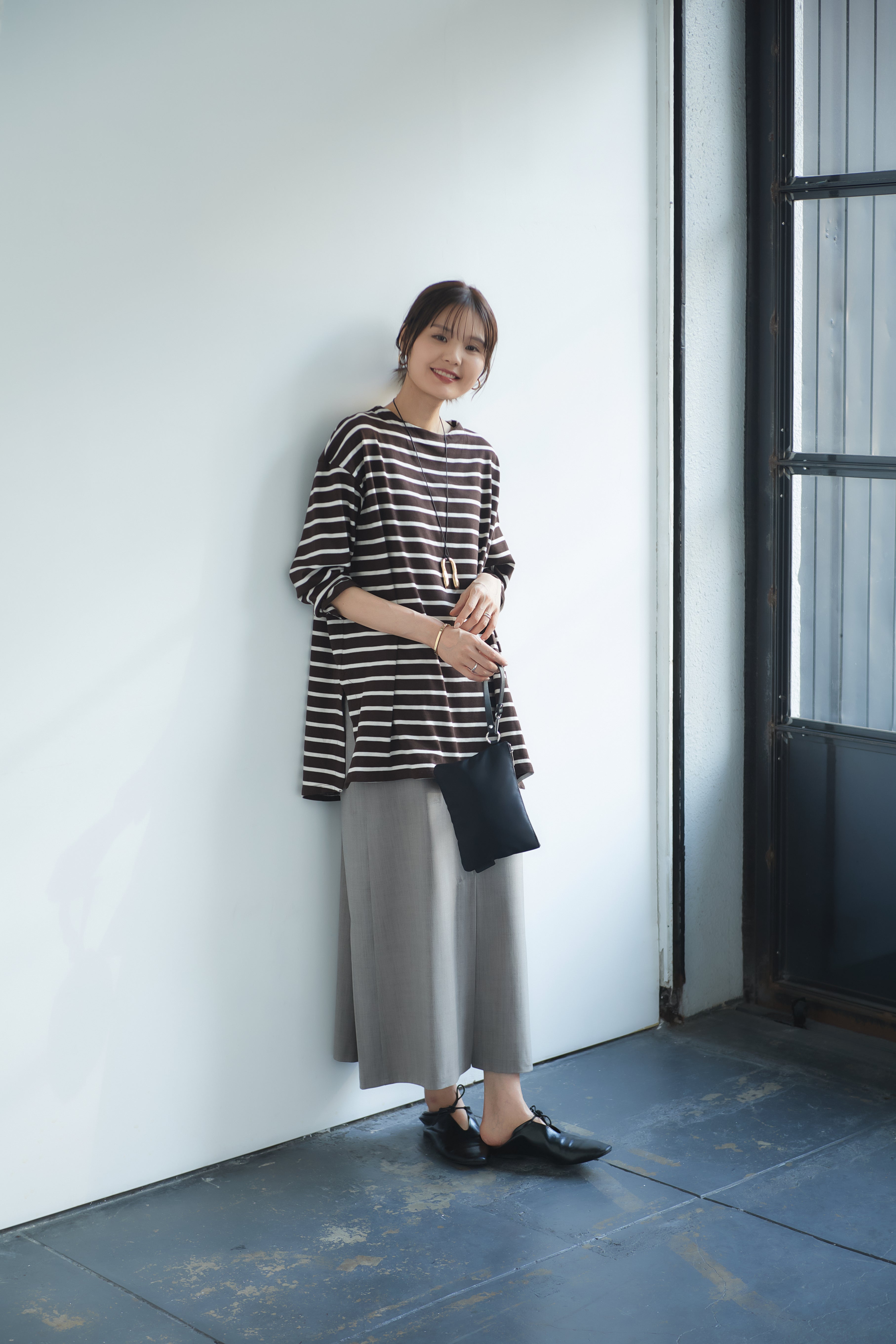 休日モードを感じさせるゆったりとしたボーダートップスにはロングスカートを合わせることで、大人のキレイめリラックスコーデに。