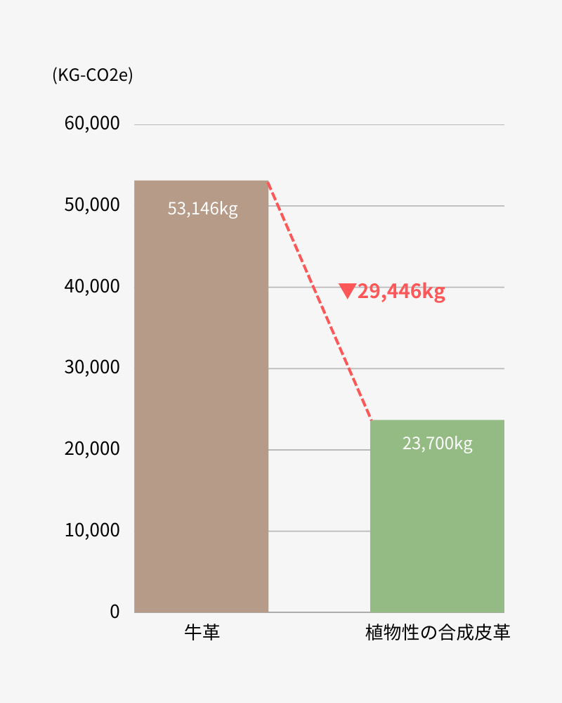 2024年にLOVST TOKYOが販売した製品を、一般的なレザー(牛革)を使って製造していたと仮定して算出すると、CO2排出量は53,146kgになります。