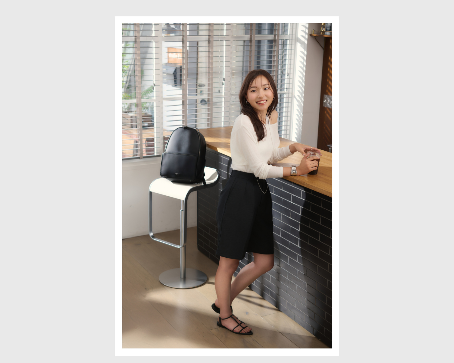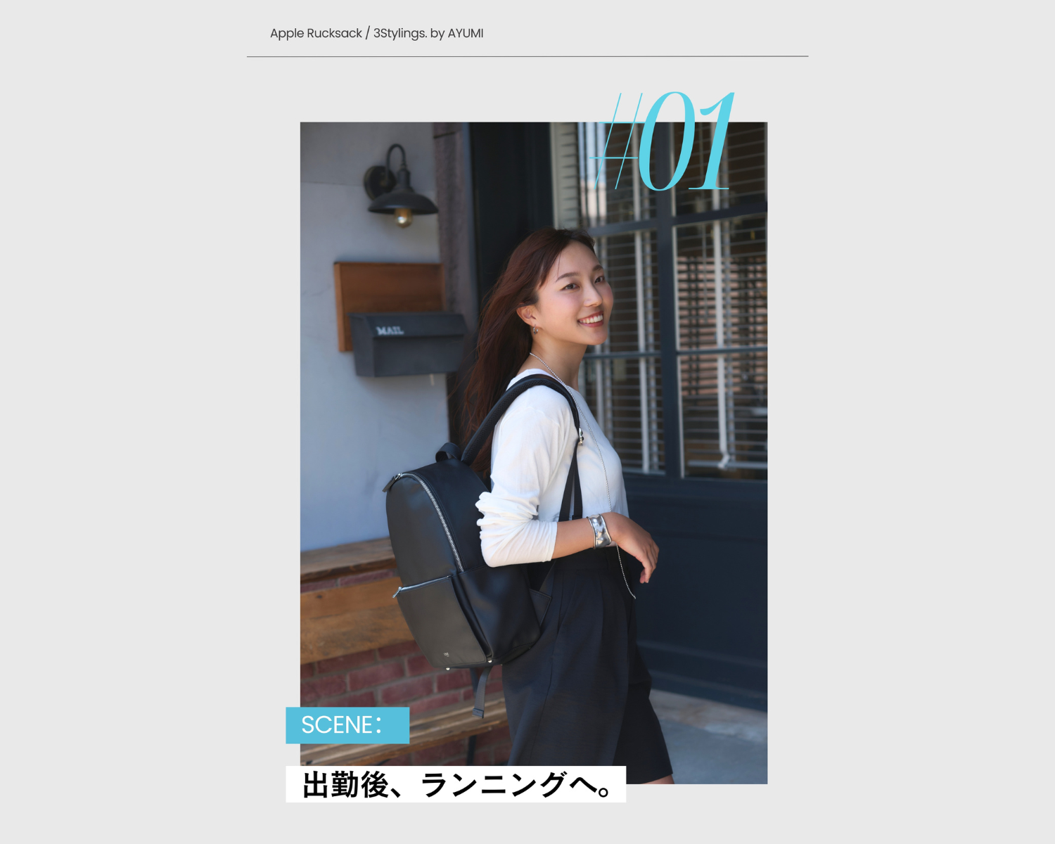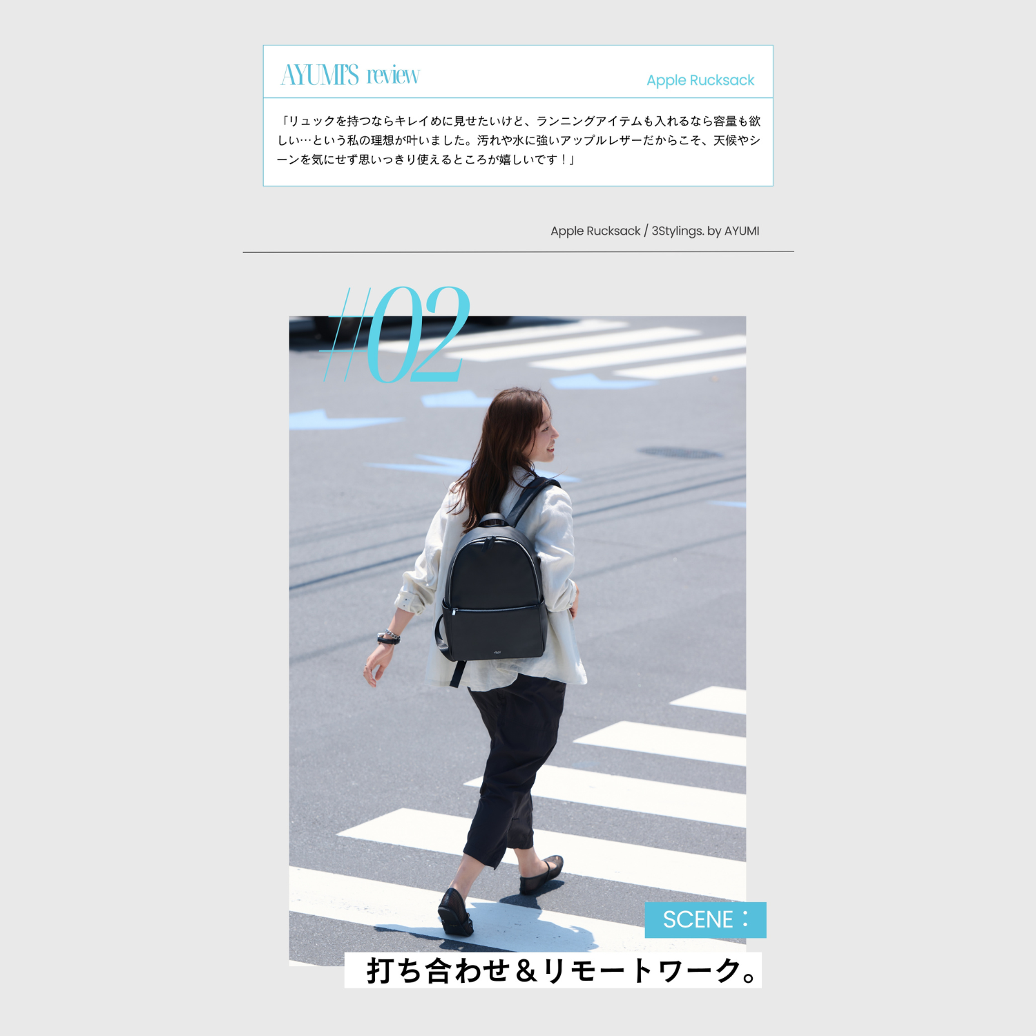 今回は早速、愛用いただいている「Apple Rucksack」のBlackを主役にお仕事からオフの日まで、AYUMIさんのコーデをシーン別にご紹介します!