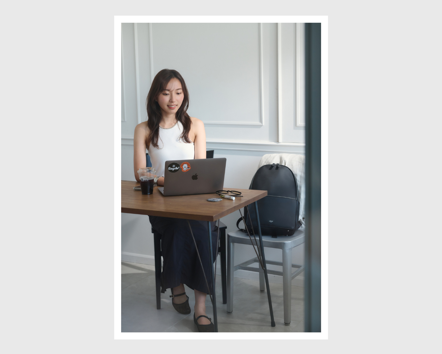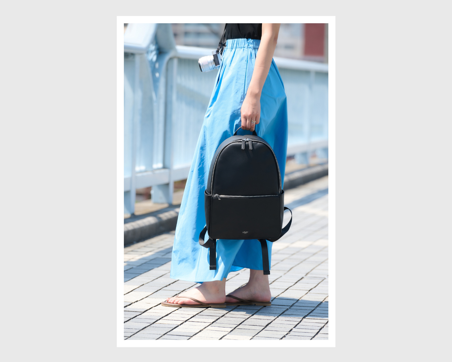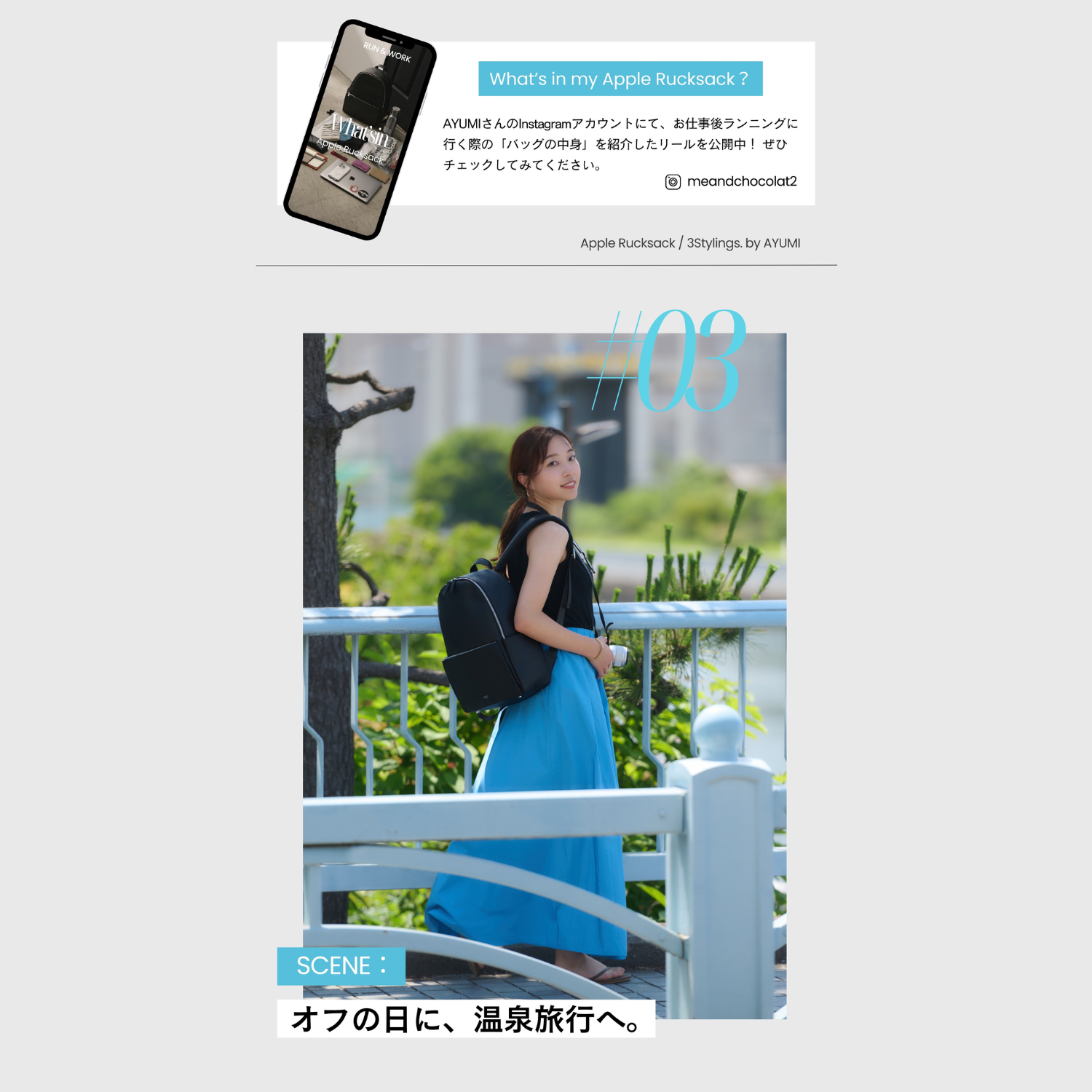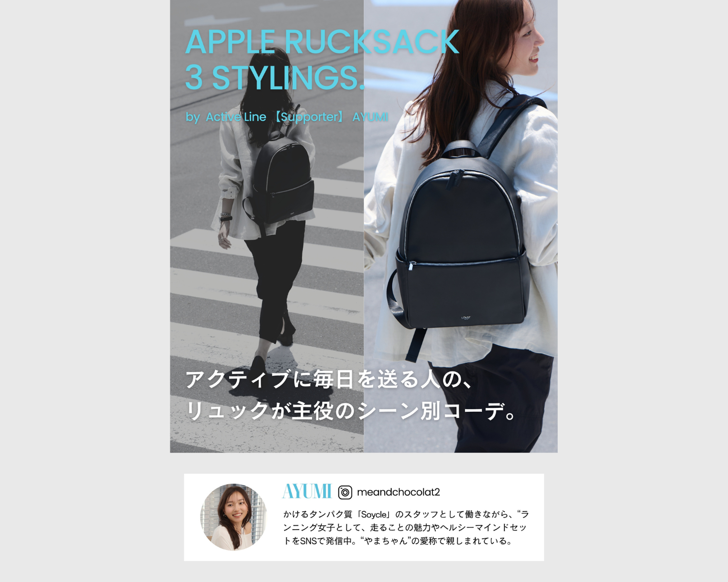 今回は早速、愛用いただいている「Apple Rucksack」のBlackを主役にお仕事からオフの日まで、AYUMIさんのコーデをシーン別にご紹介します!
