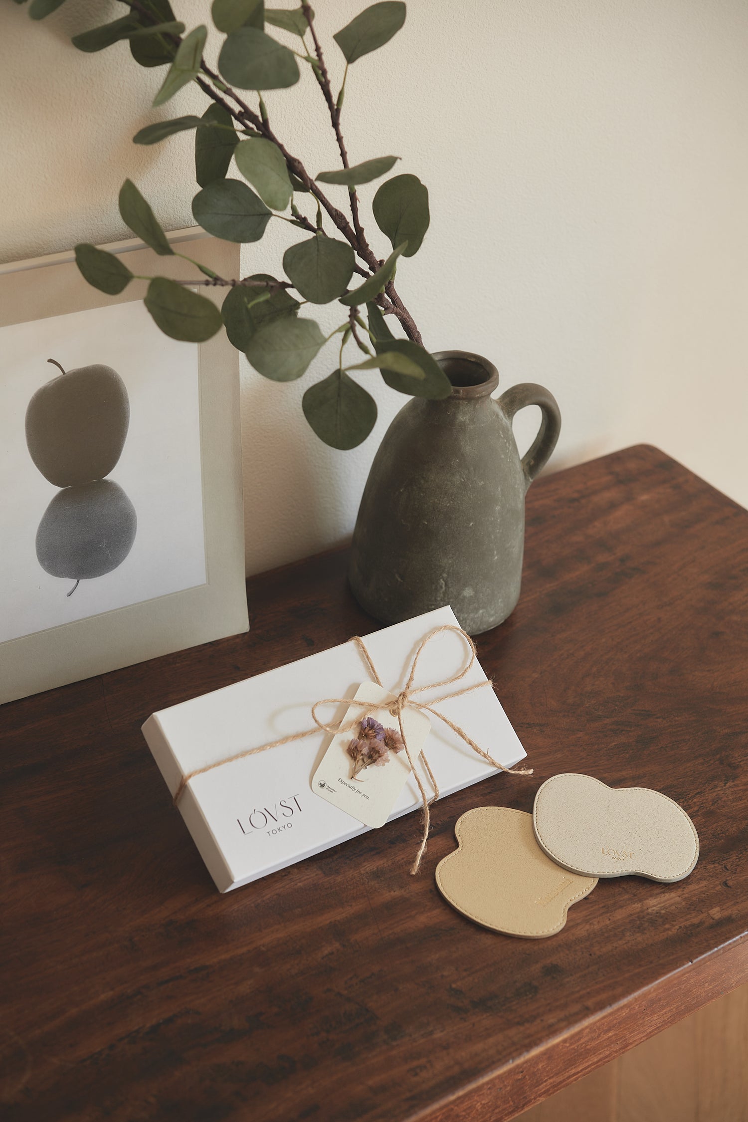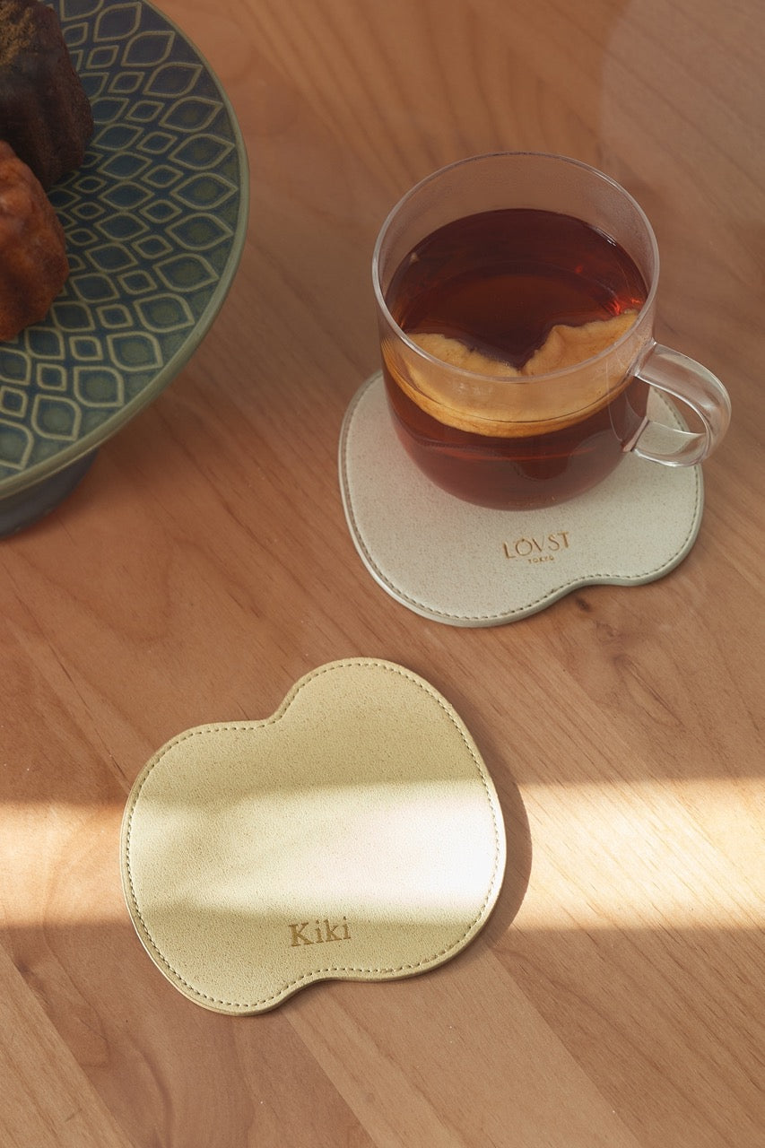 「Apple Coaster」は、りんごのニュアンスフォルムが特徴のアップルレザー製コースター。