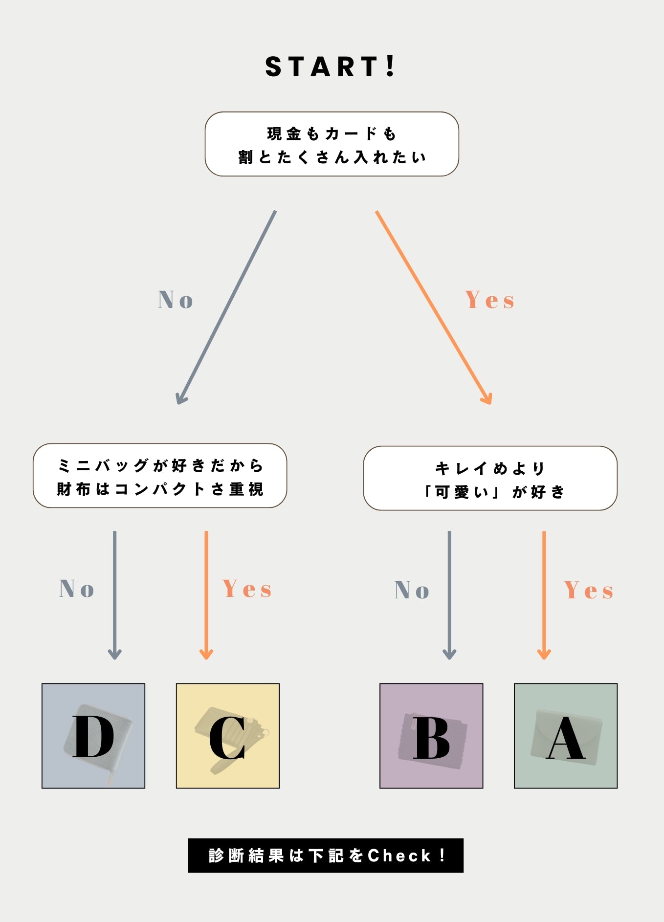 ご自身のお好きな系統や、お財布に求める機能性に合わせて質問に答えていくと、あなたにぴったりのものがきっと見つかるはず。