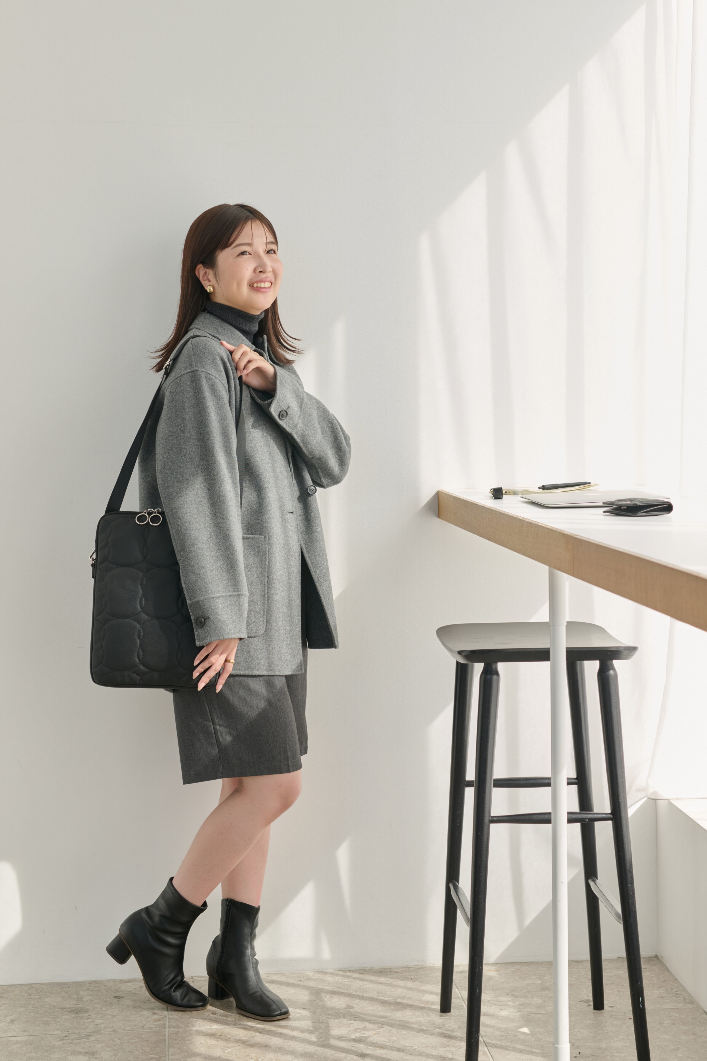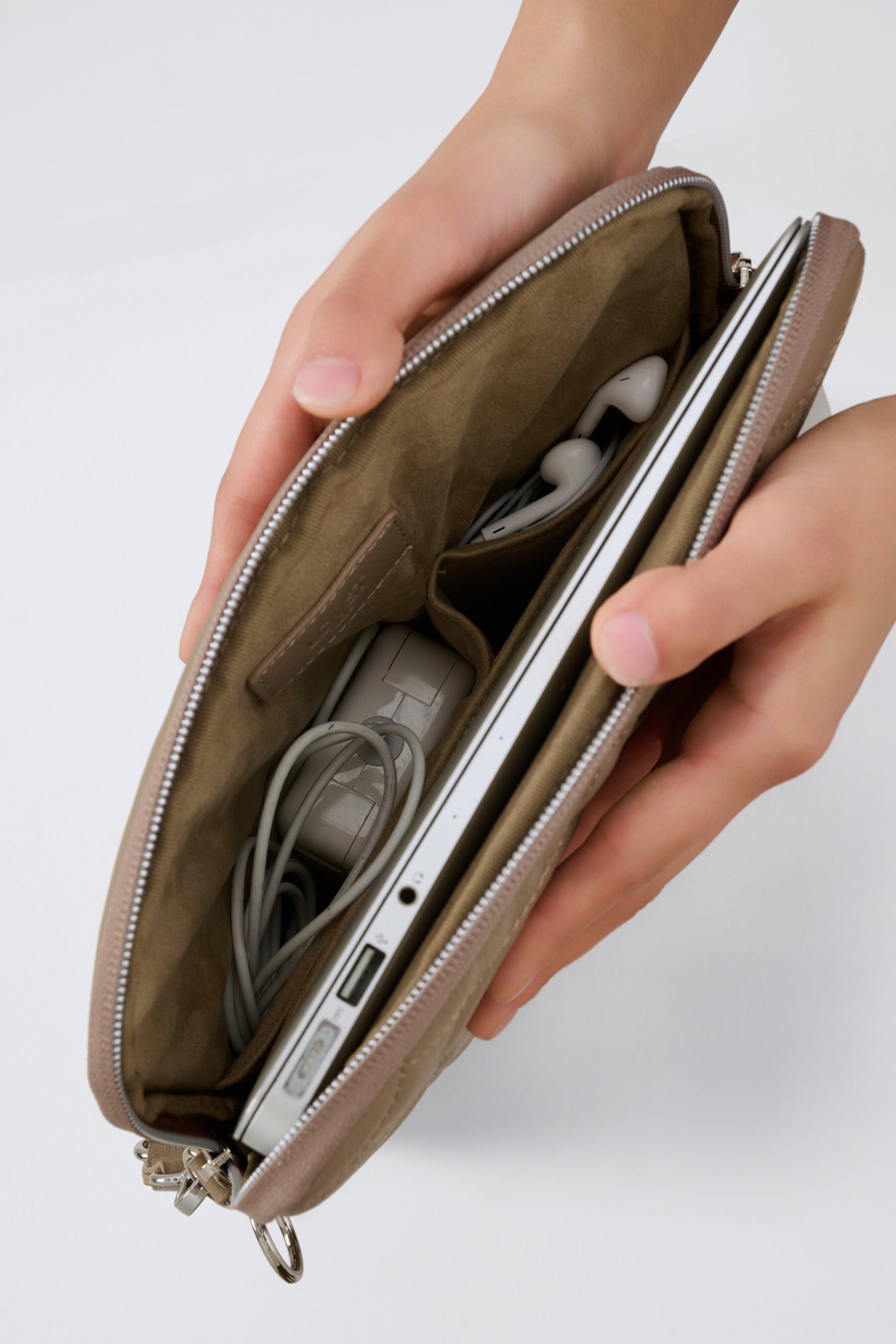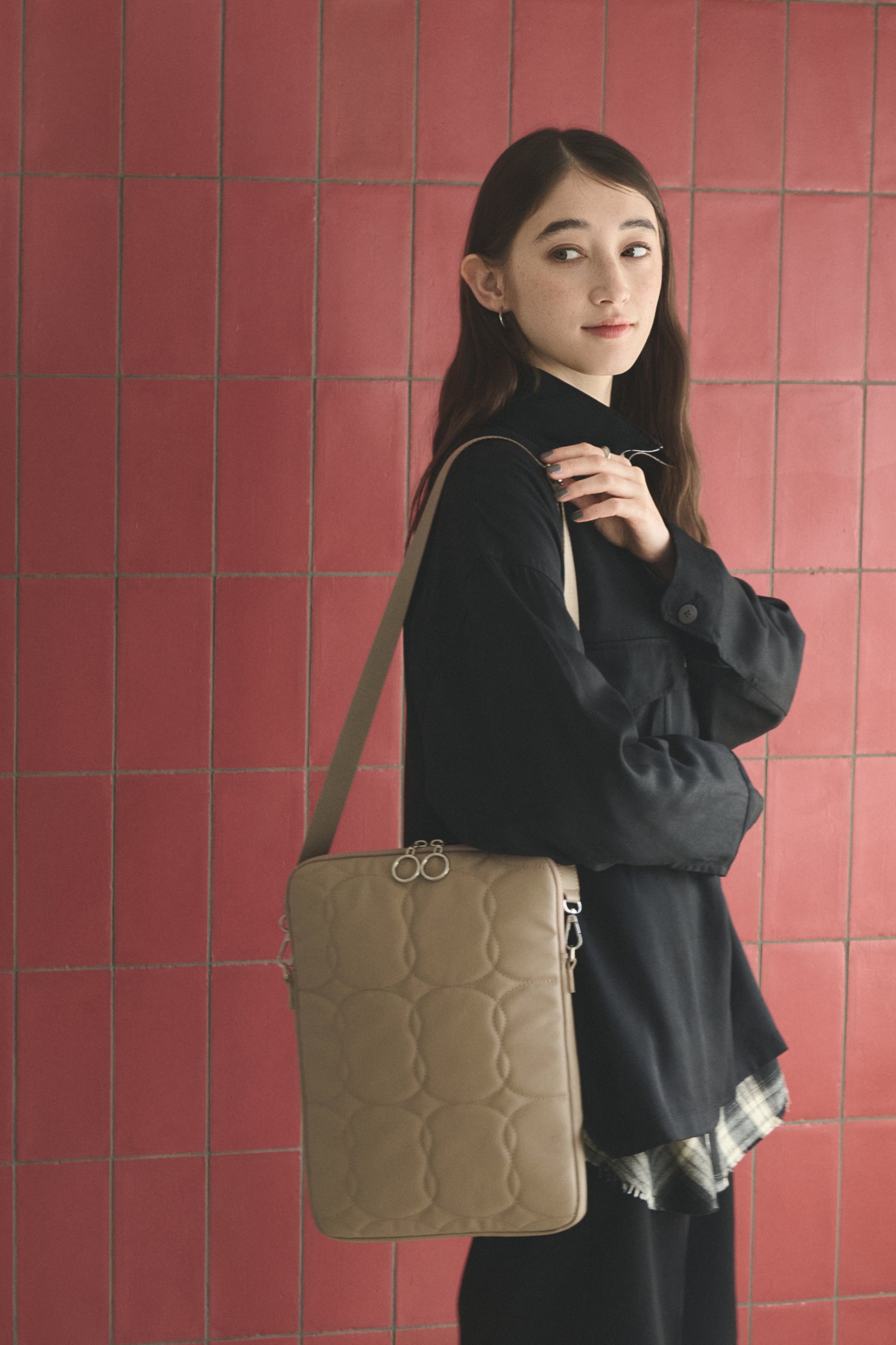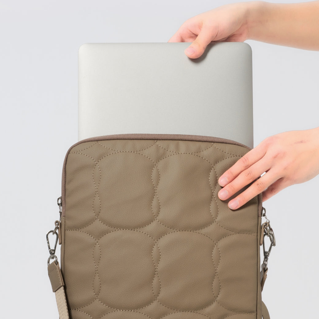 デザインと機能性がきちんと両立した、使い勝手の良いPCケースです! りんごのニュアンスシルエットのキルティングは、実際持ってみると程よい可愛さで上品さもあり、お仕事からオフの日のカジュアルスコーデまで、幅広いスタイリングに合わせやすいデザインだなと思いました。