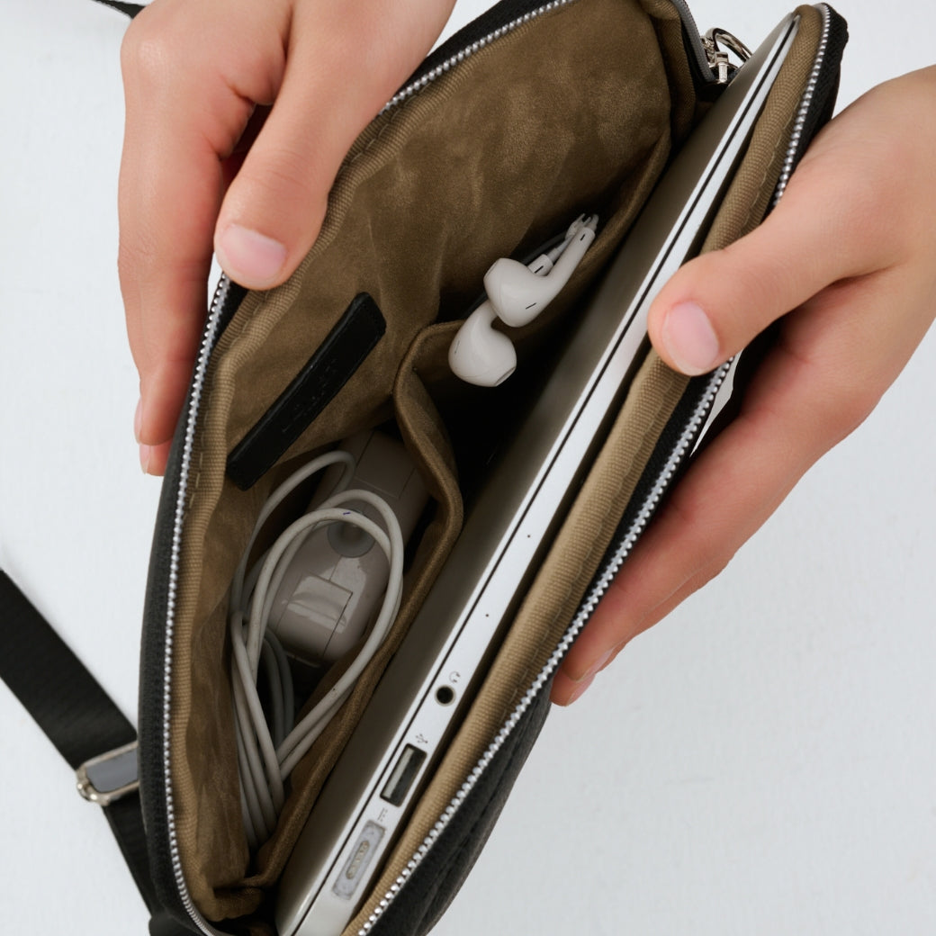 取り外しできるストラップにより、ノートパソコンバッグとしても、シンプルなケースとしても使うことが可能です。