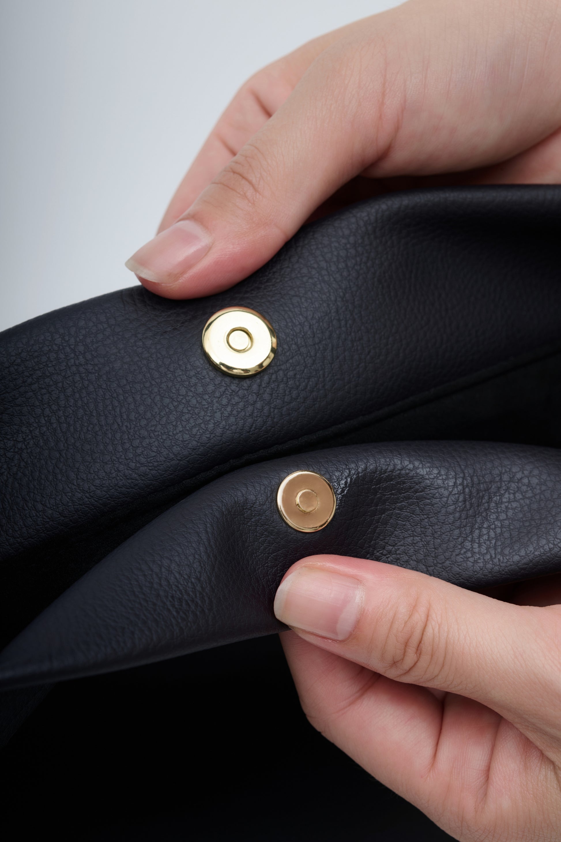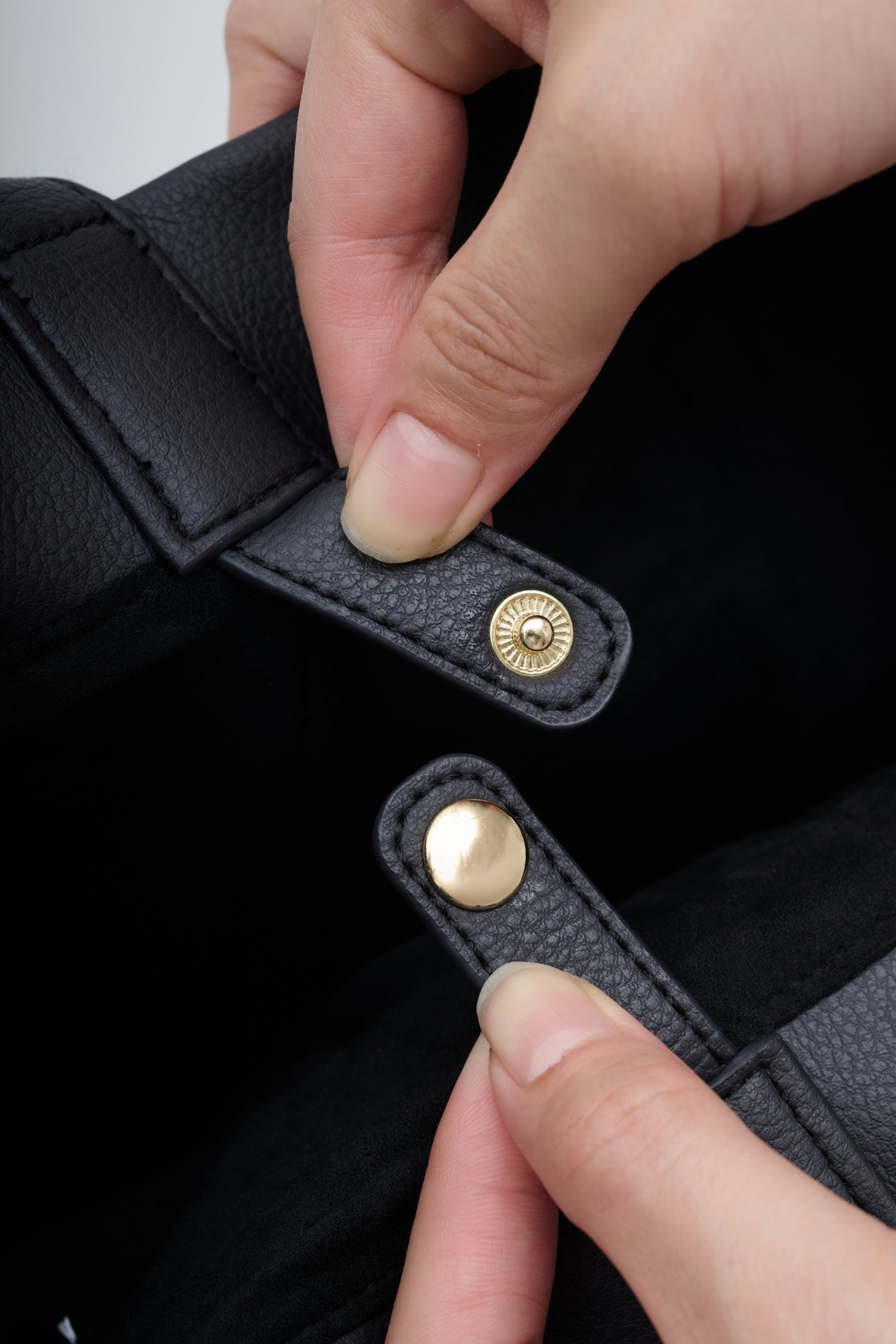 スナップボタンは、バッグの縁を内側に折り返し、中央で止めていただくことでシルエットチェンジができます。
