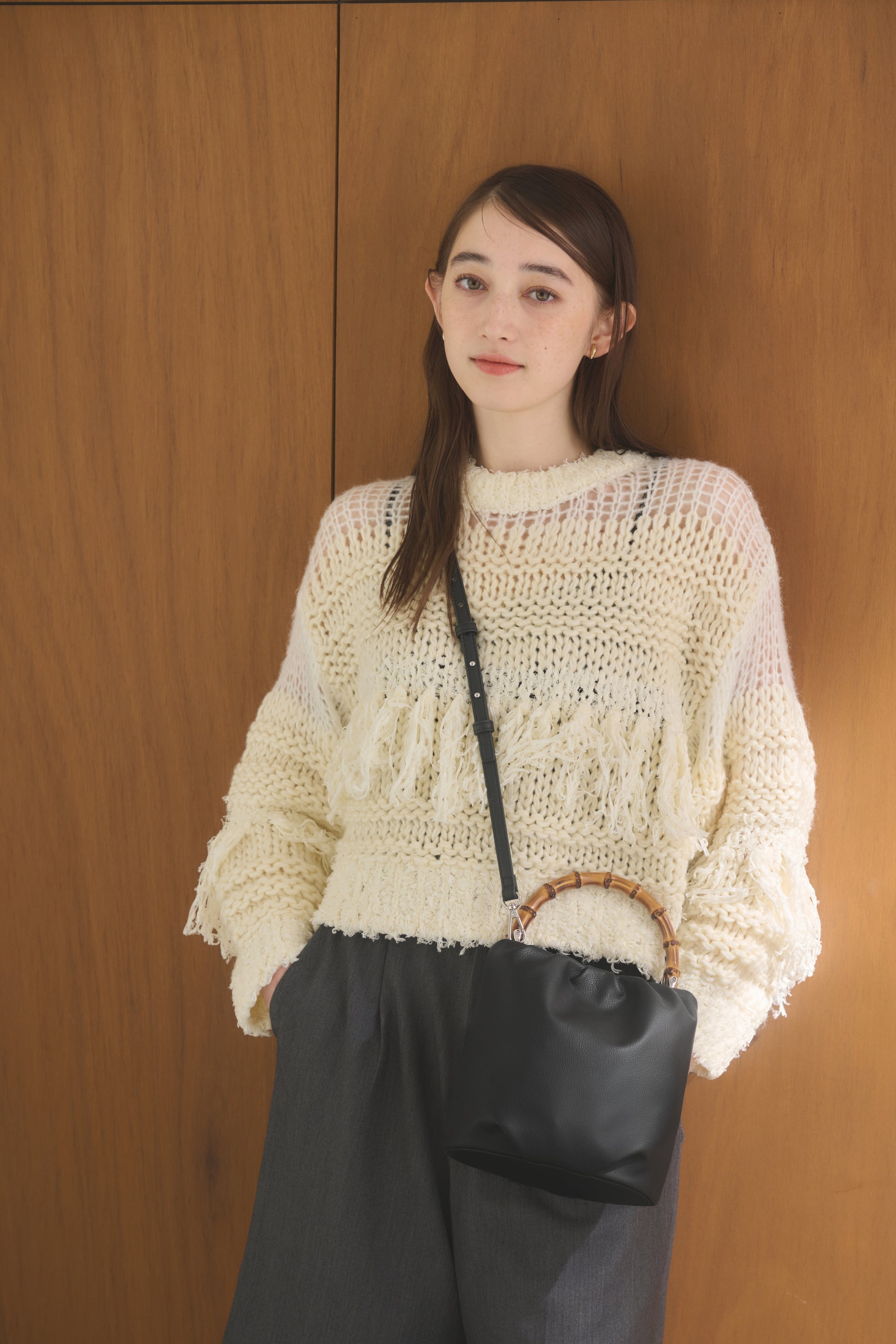バンブー・チェーンの2種類の持ち手とショルダーストラップ を組み合わせることで、4通りのデザインで使うことができるミニバッグです。