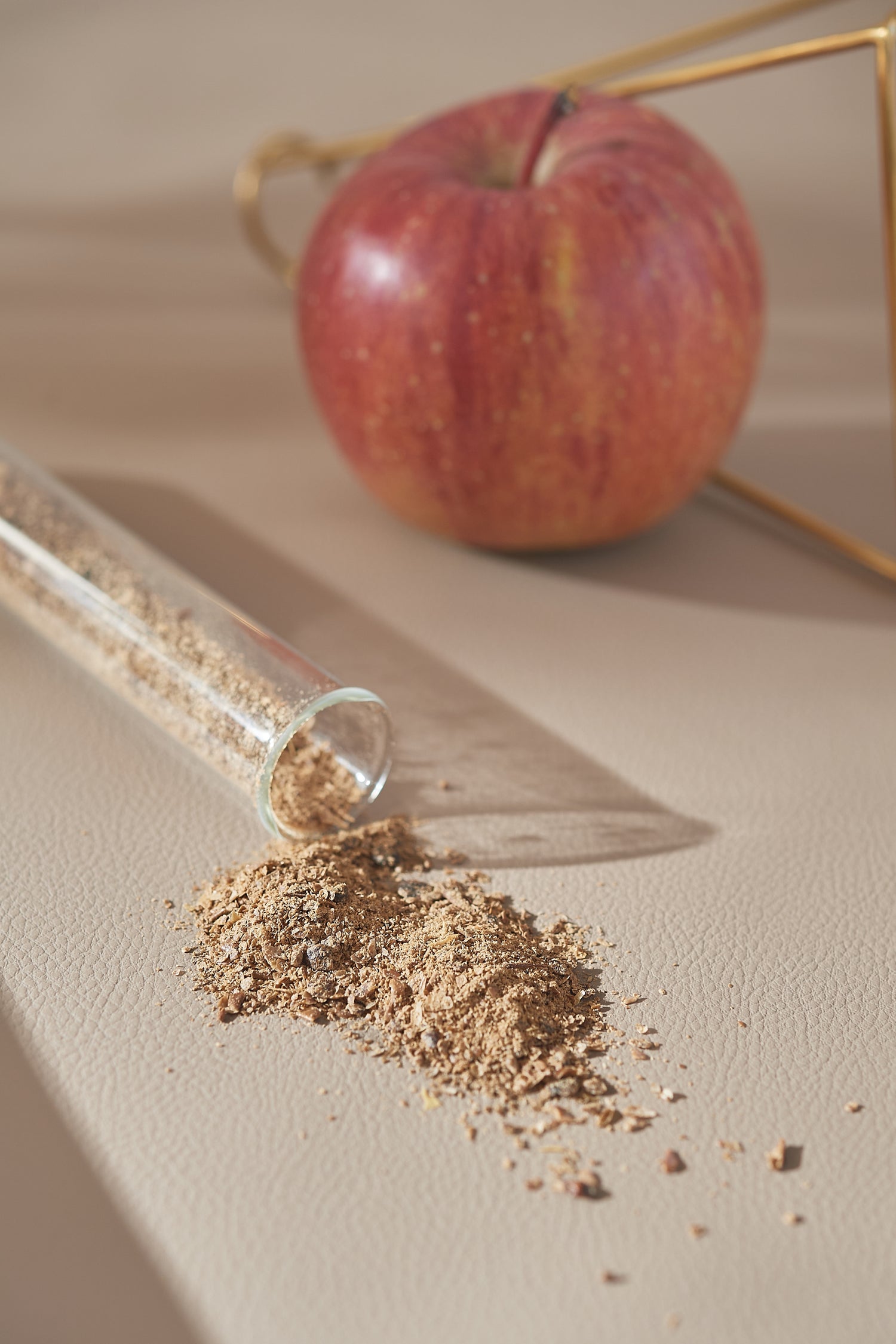 合成レザーの一部の原料に、リンゴジュースの搾りかすを加えることで、石油由来の原料の使用を抑えています。
