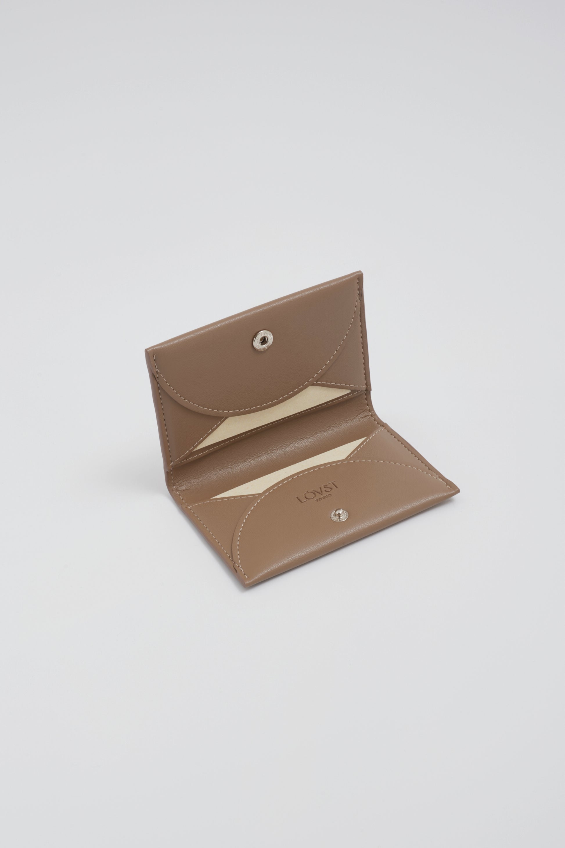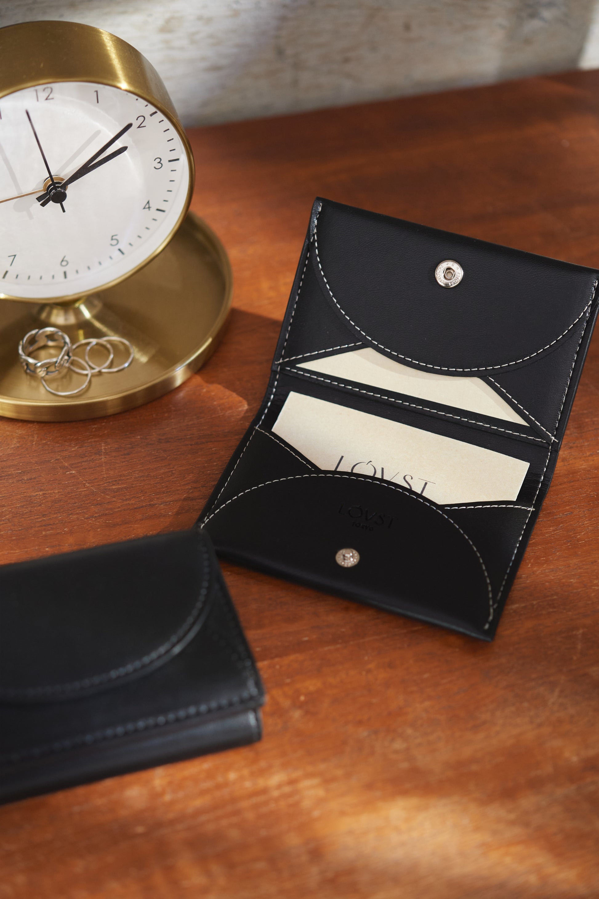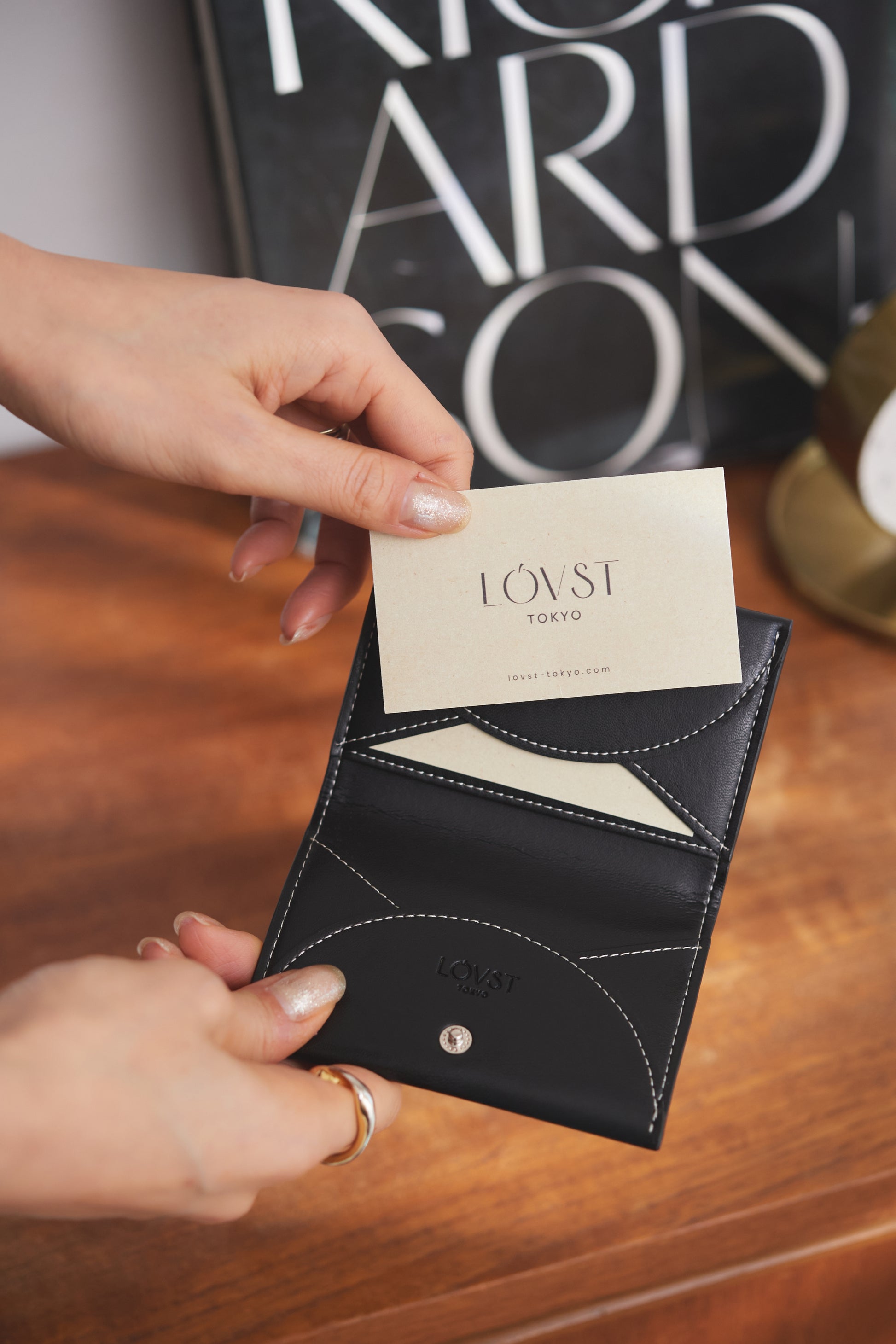 折りたたみ式の名刺入れは、内側のスナップボタンで留められる仕様。バッグの中等で勝手に開いてしまうことがないので安心です。
