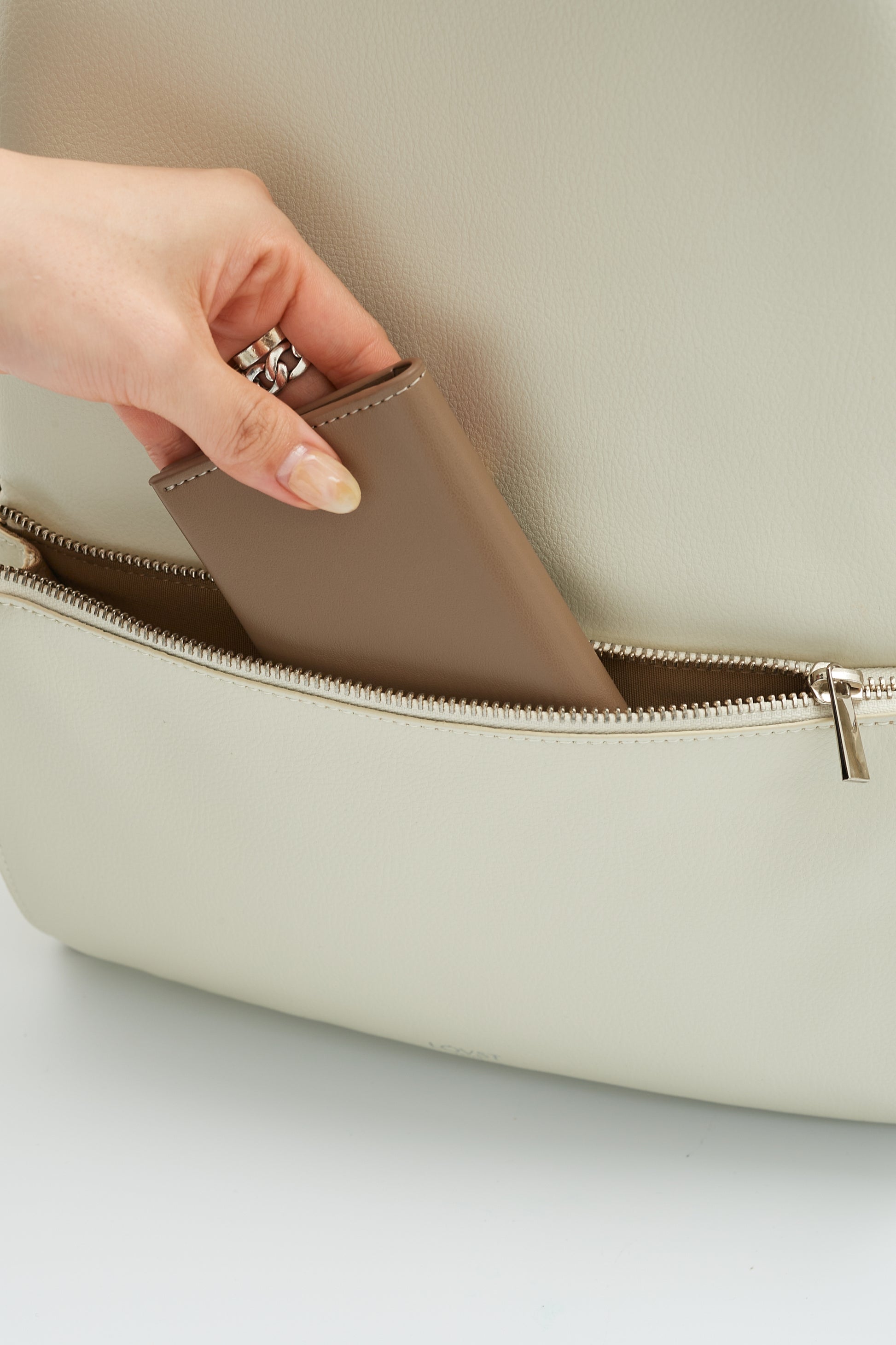 ・大きなフロントポケットには、しっかりマチがあるため、厚みのある本やクッションファンデーションなどを入れても対応できるサイズ感。